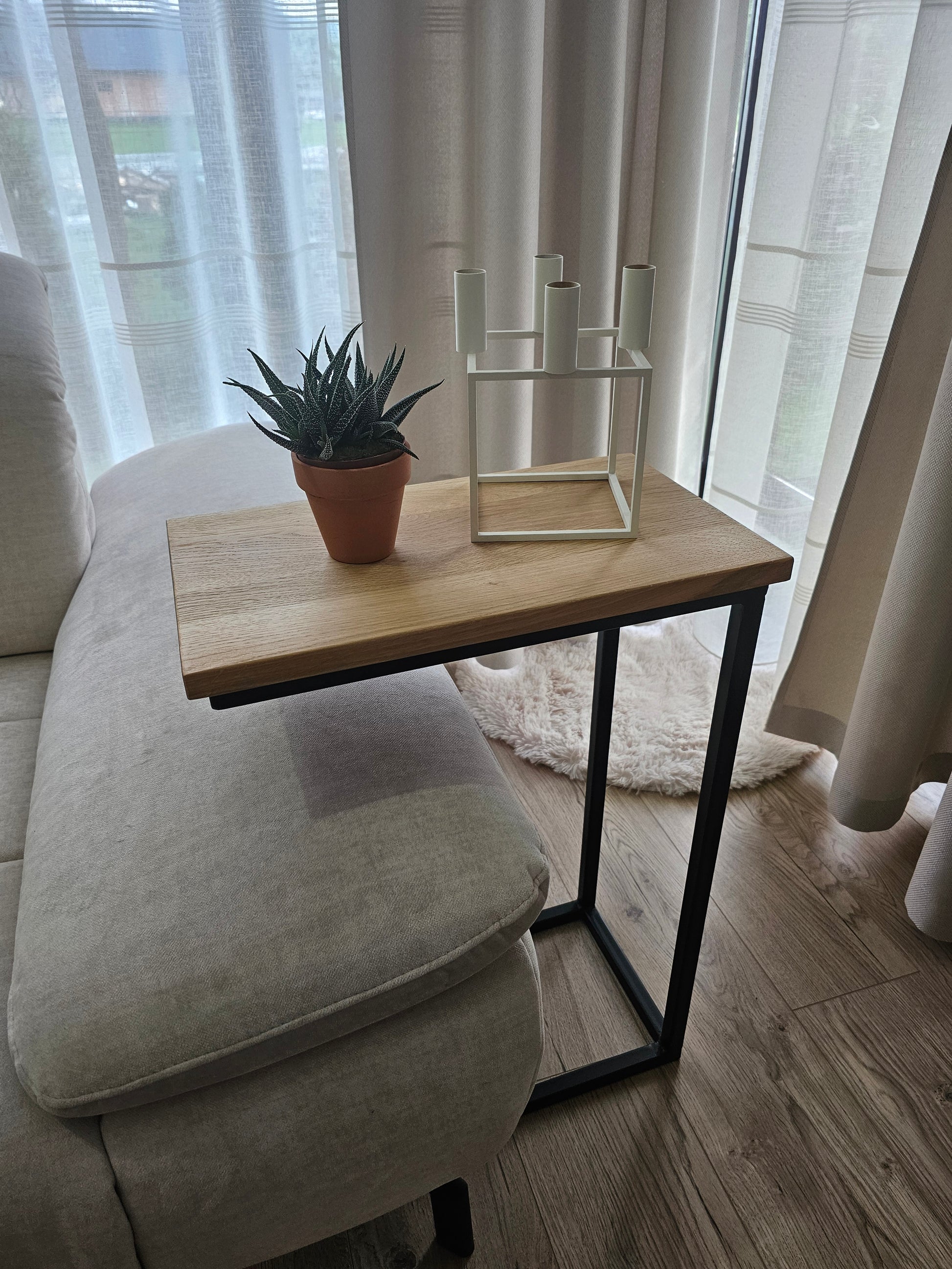 Side sofabord i sortlakeret metal med matlakeret egetræsbordplade
