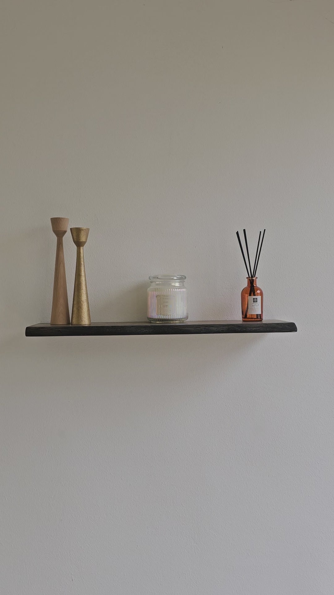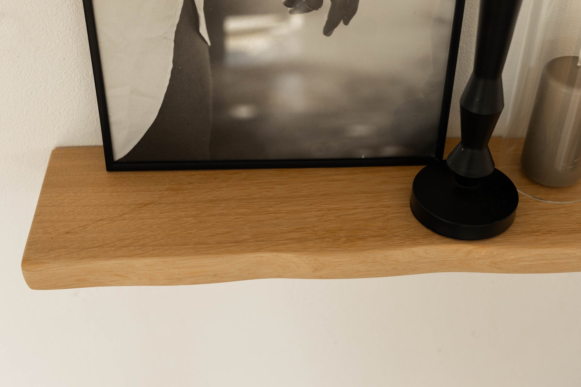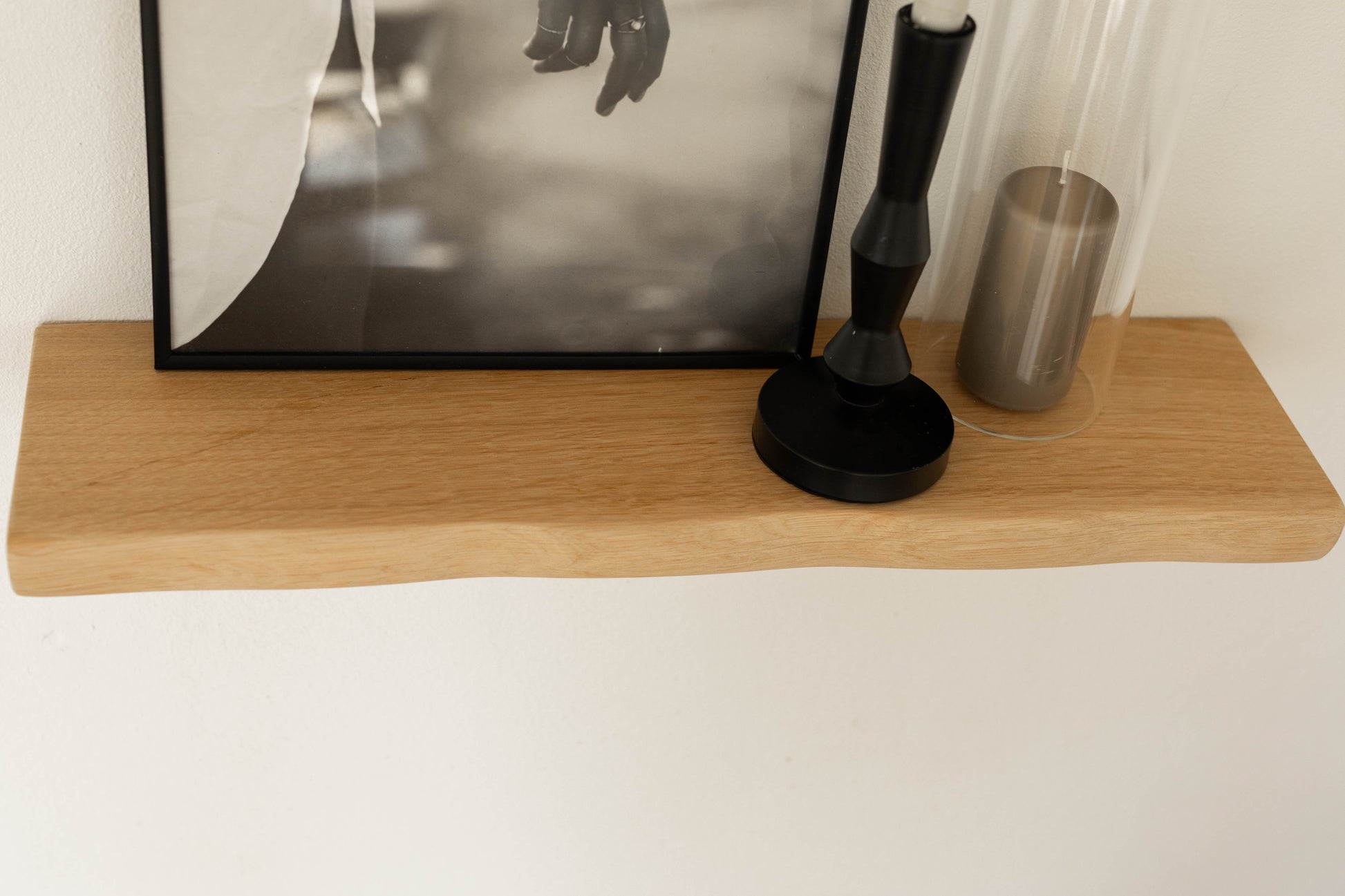Svævehylden er elegant og stilren og fås i ubehandlet egetræ eller behandlet med olie, hvilket påføres efter ønske ved bestillingen.